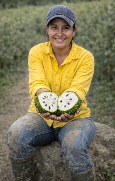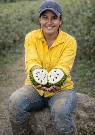 Cuidó cada arbolito con paciencia y fe. Pasó el tiempo… hasta que un día apareció la primera guanábana, grande y verde, como un regalo del cielo. Luego vinieron más.